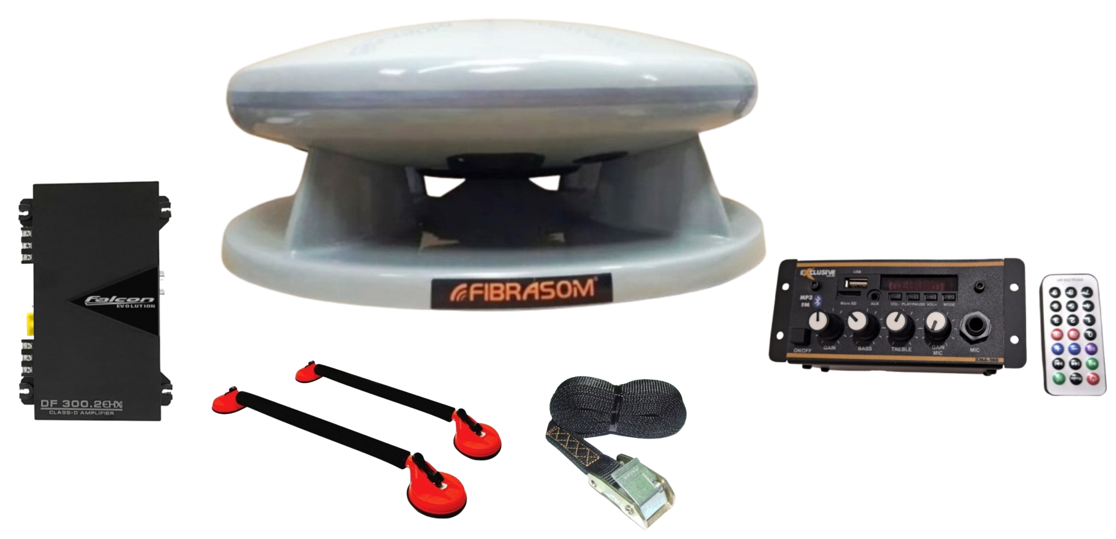 Kit composto de : 1-Caixa PV 350 / 1- Módulo de Amplificação / 1- Mixer Bluetooth / MP3 / FM / Entrada microfone / 1 - Rack ventosa com cinta de segurança